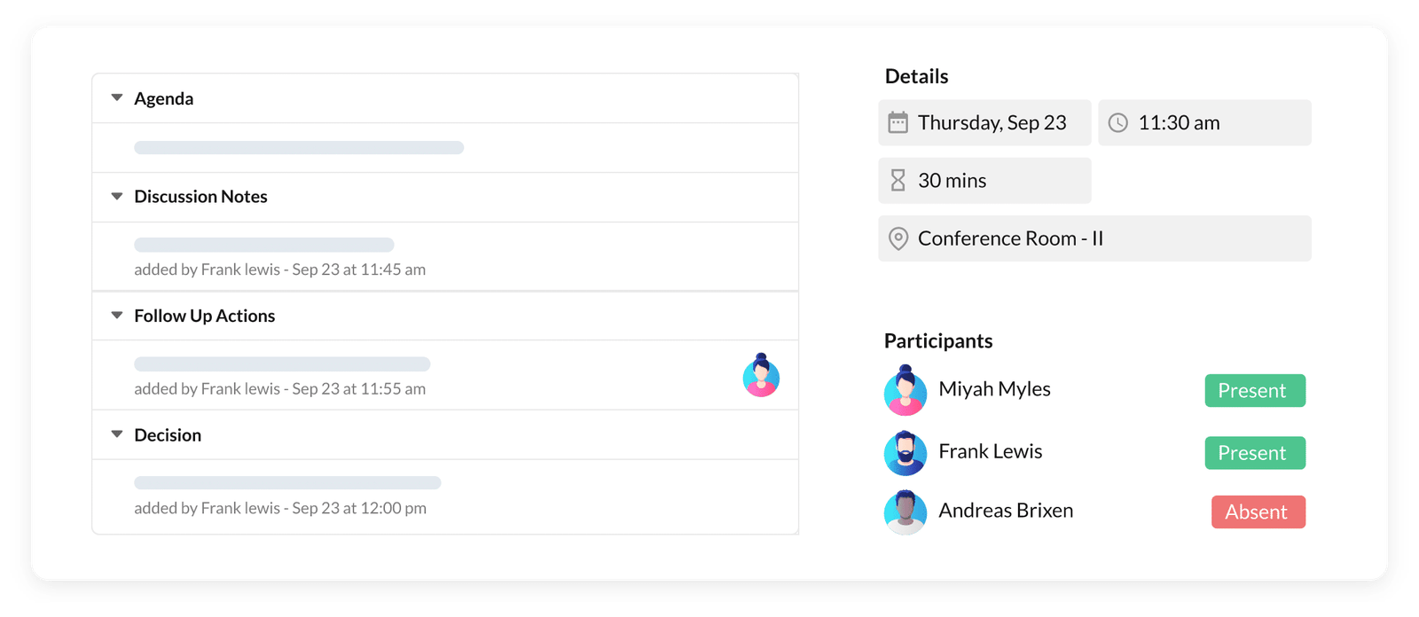 Note down key meeting minutes and never lose any information. Moreover, share it with participants to decide follow-up actions.